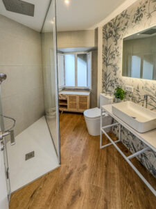 On the ground floor, guests have access to a shared bathroom (8 m²) equipped with a shower and toilet, as well as a separate WC.