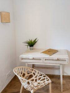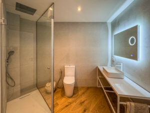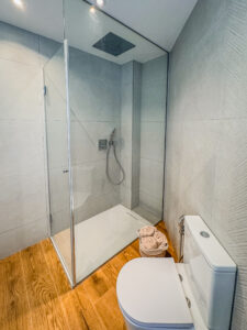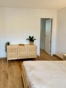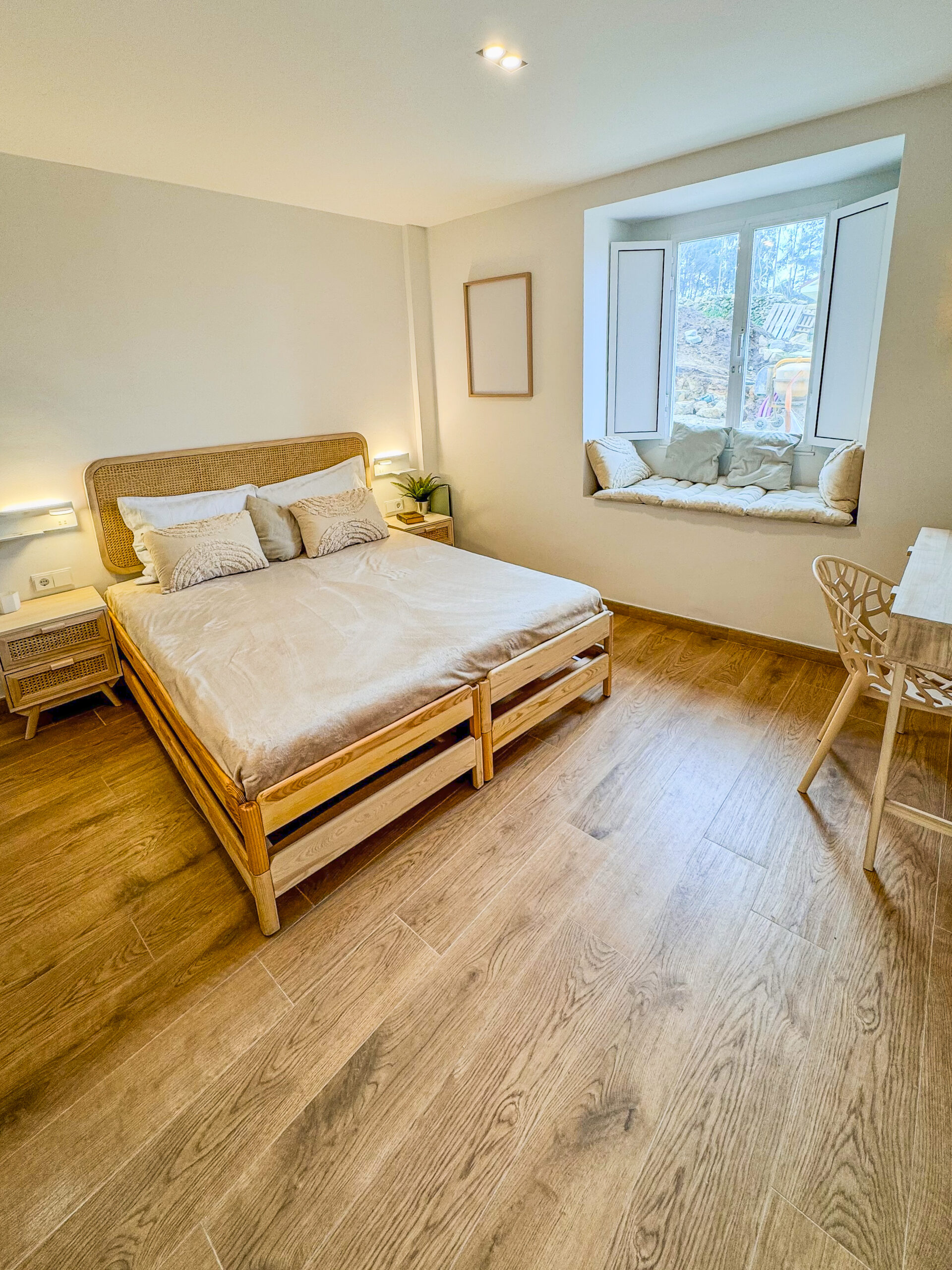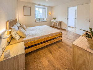 A cozy, modern room featuring a private bathroom. Perfect for couples looking to enjoy comfort, privacy, and relaxation in a newly renovated space.