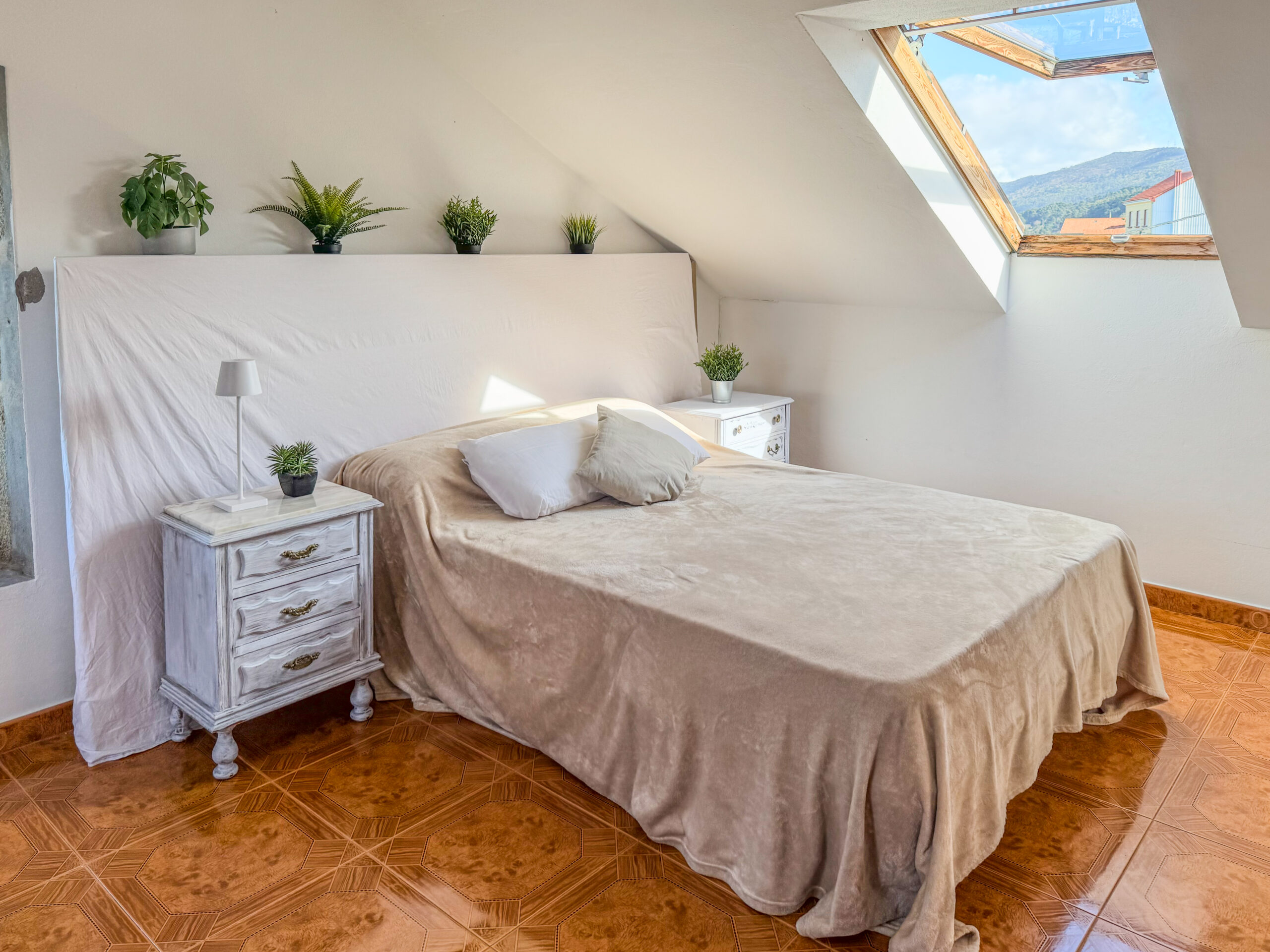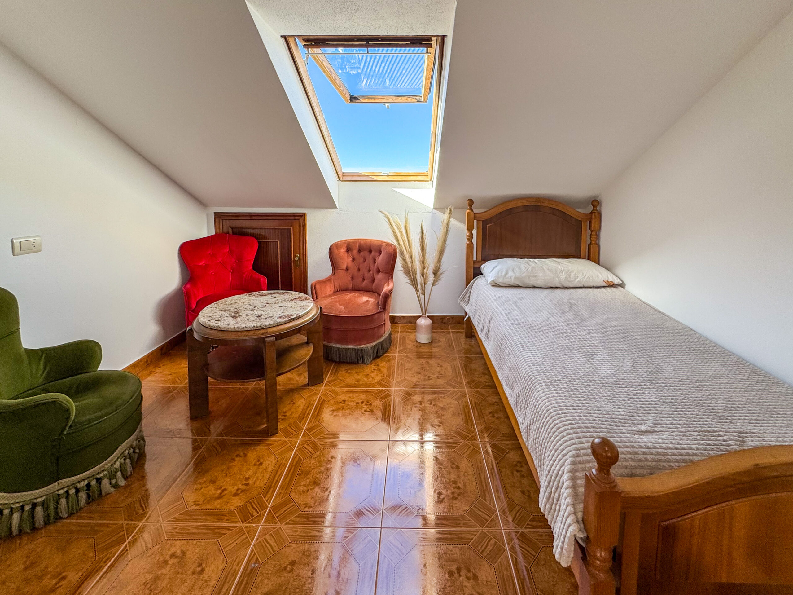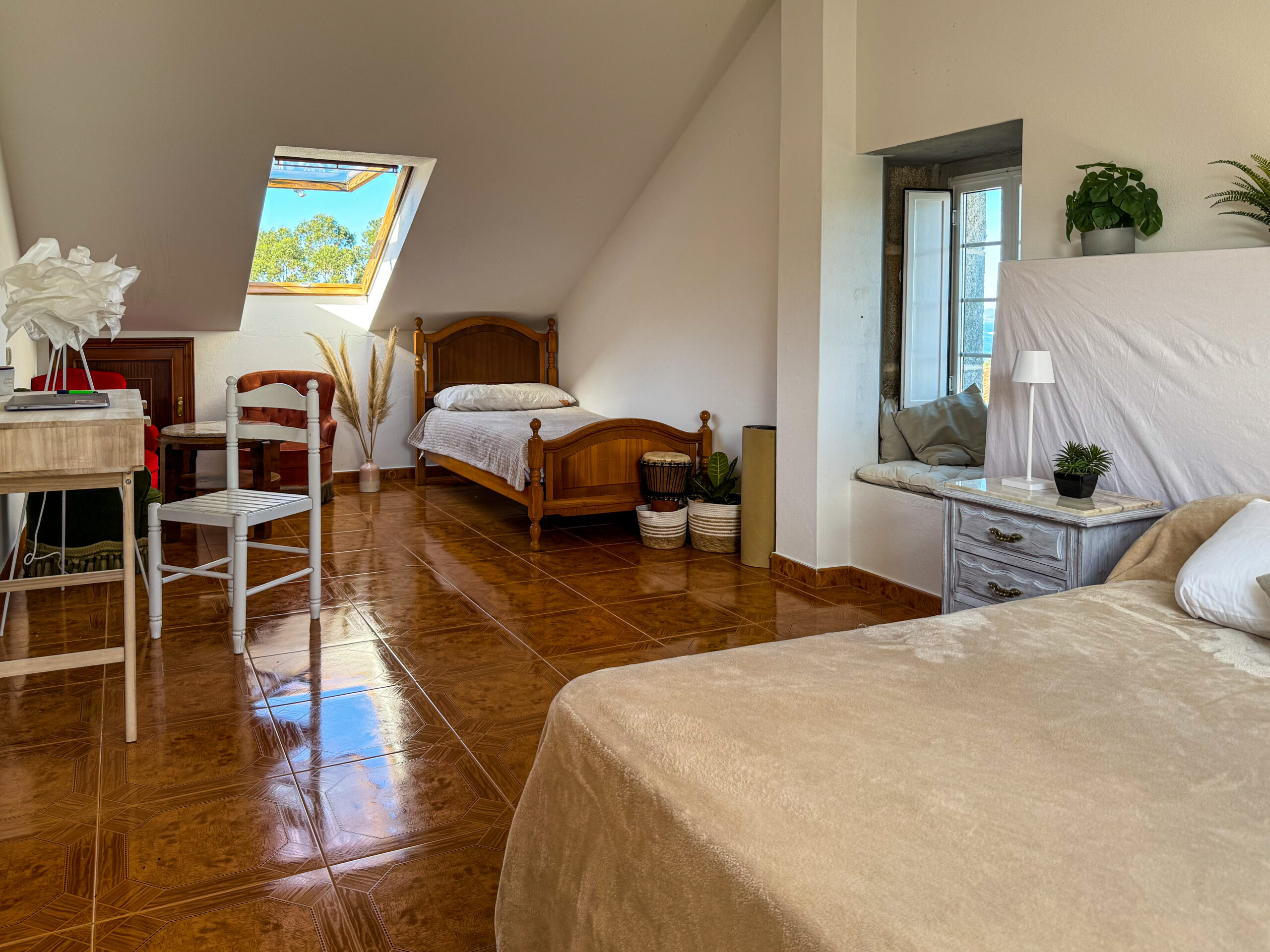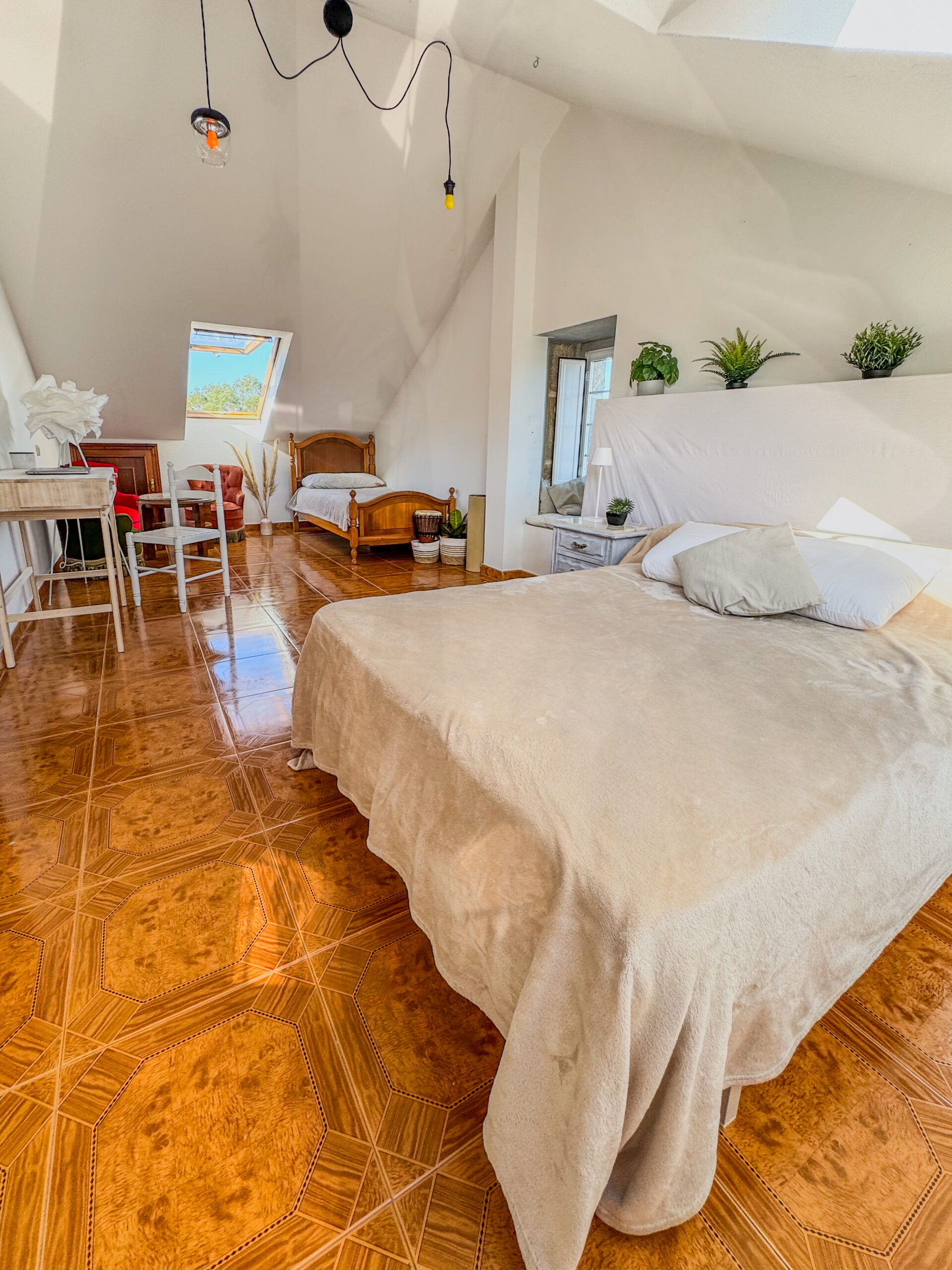 A spacious and bright triple room with a queen-size bed and an additional single bed. Perfect for small families, friends, or couples who appreciate extra space and comfort. The room is located in the attic and features warm wooden flooring, sloped ceilings, and access to a shared bathroom.